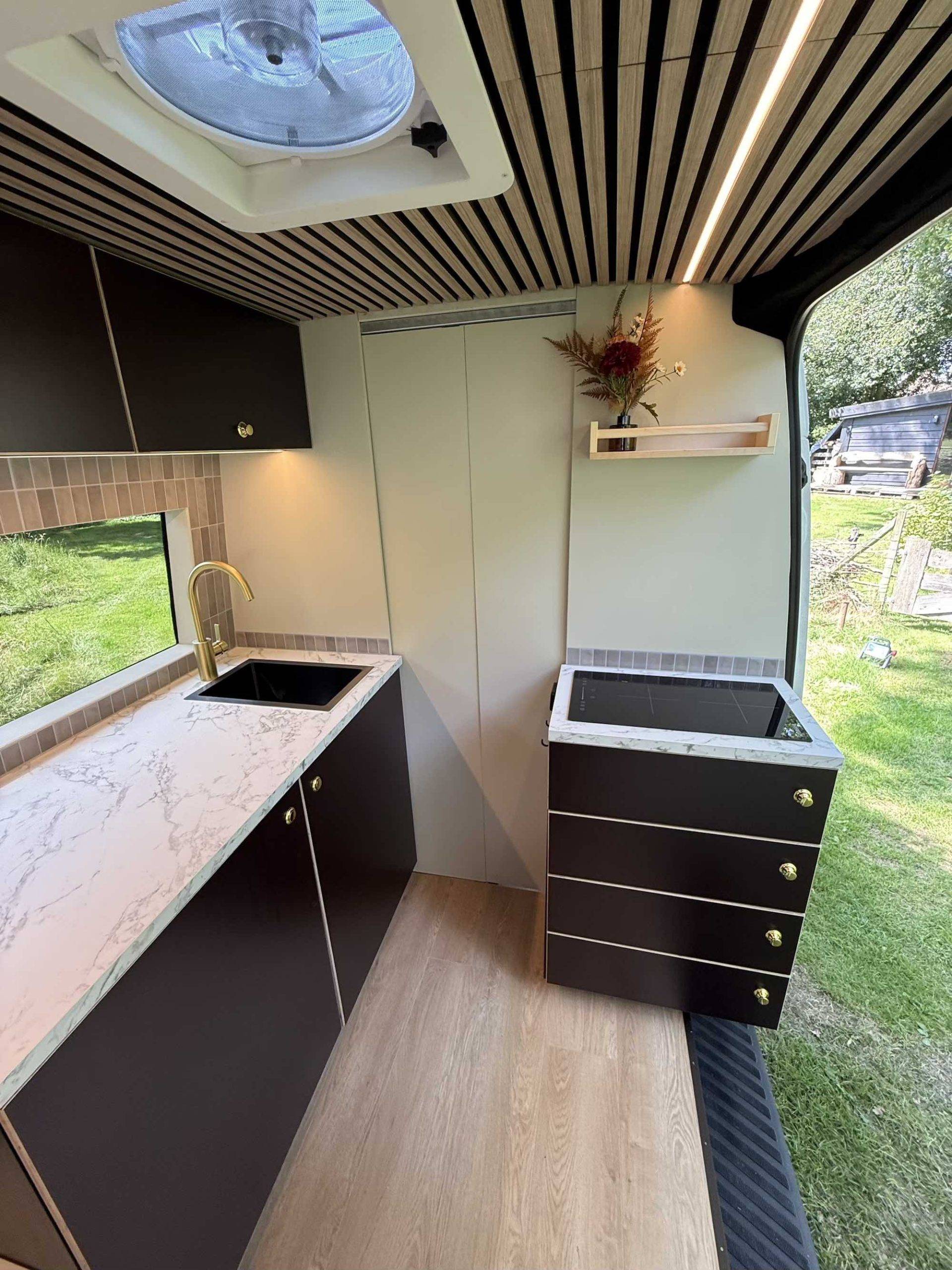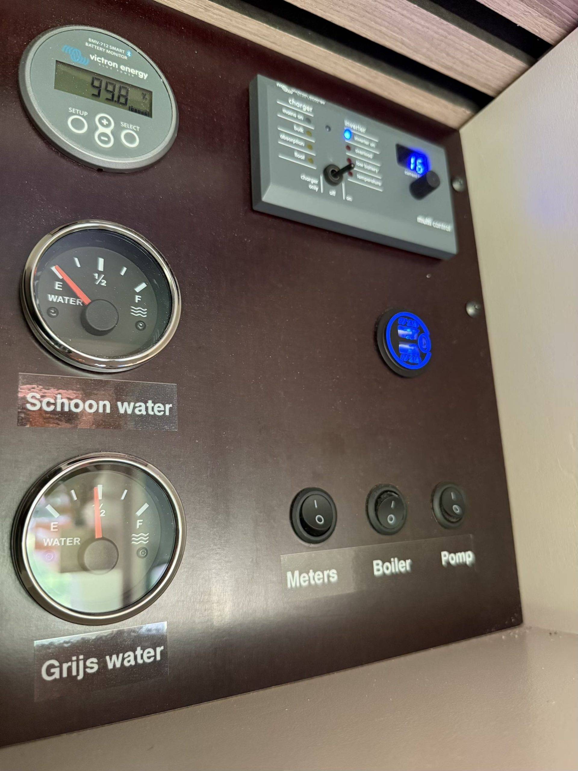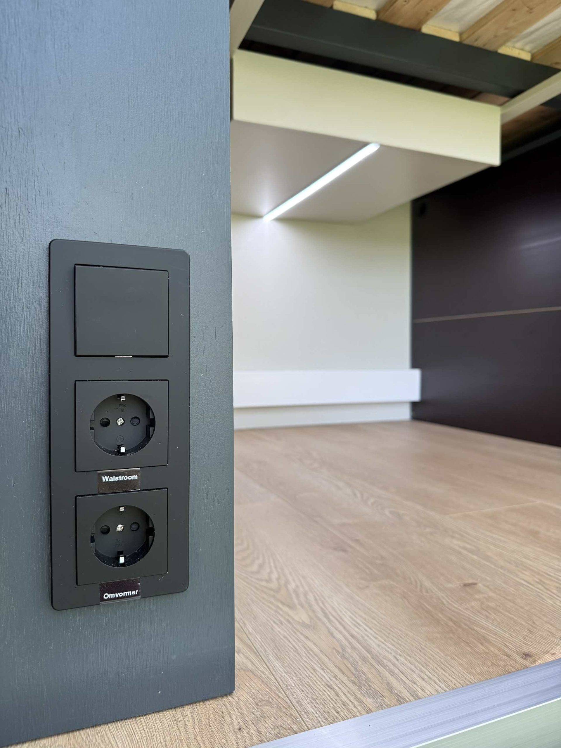 Deze camper is zelfvoorzienend te gebruiken dankzij zonnepanelen, laden via de dynamo en een krachtige lithiumaccu. Het elektrisch systeem is door ons op maat ontworpen en biedt alles wat je nodig hebt: koken op inductie, warm water via een elektrische boiler en verwarming of koeling met de dakairco.