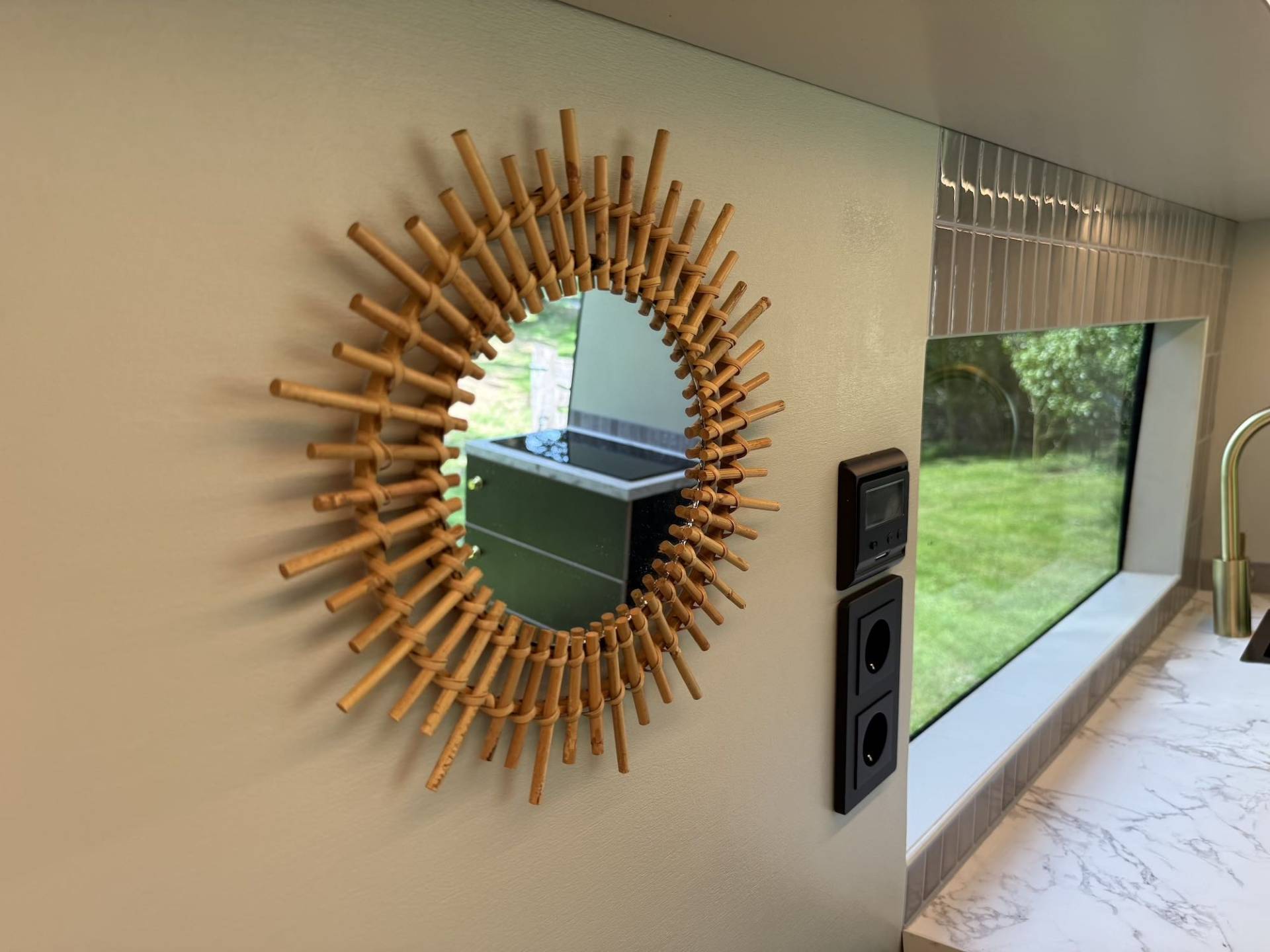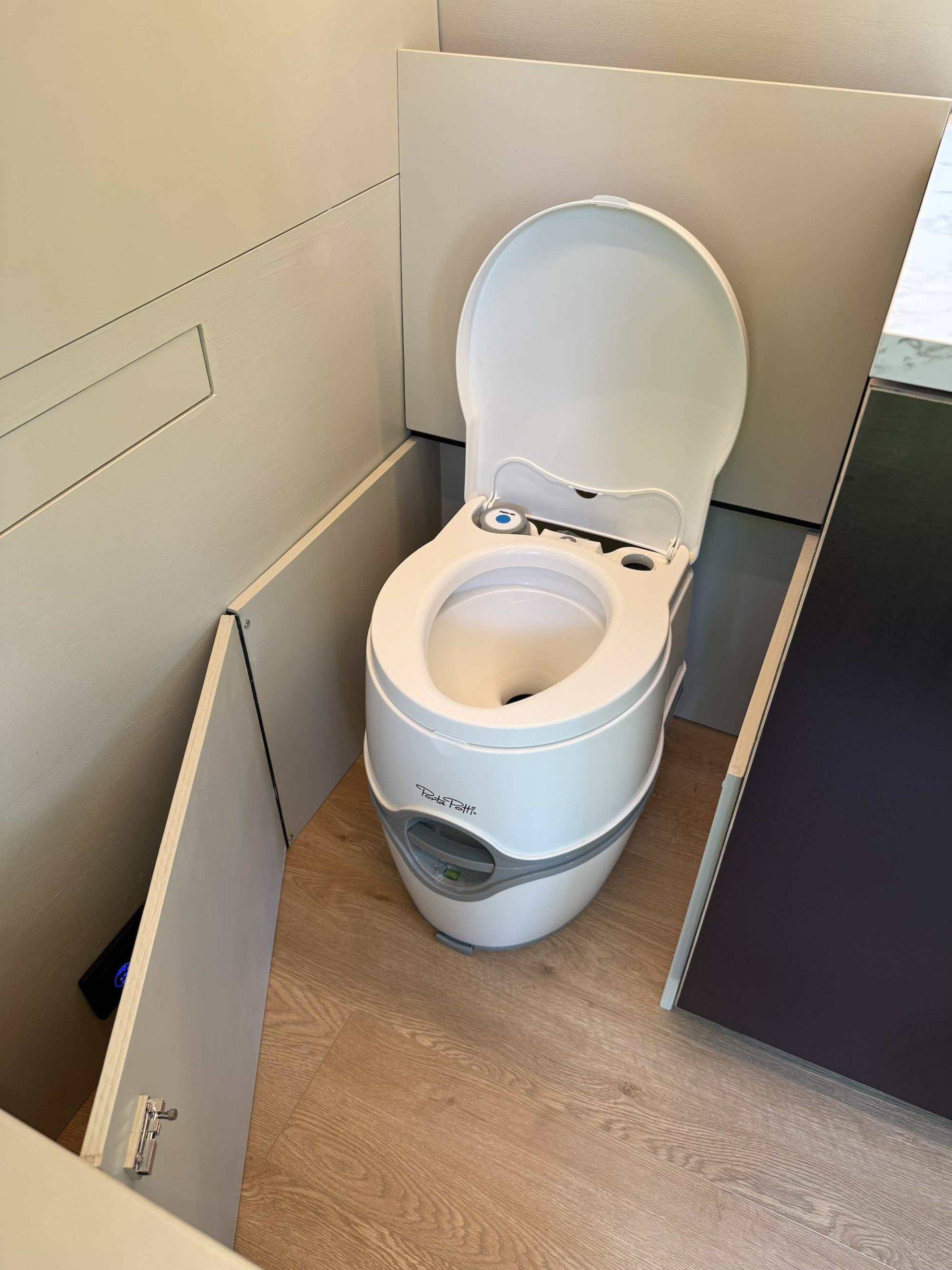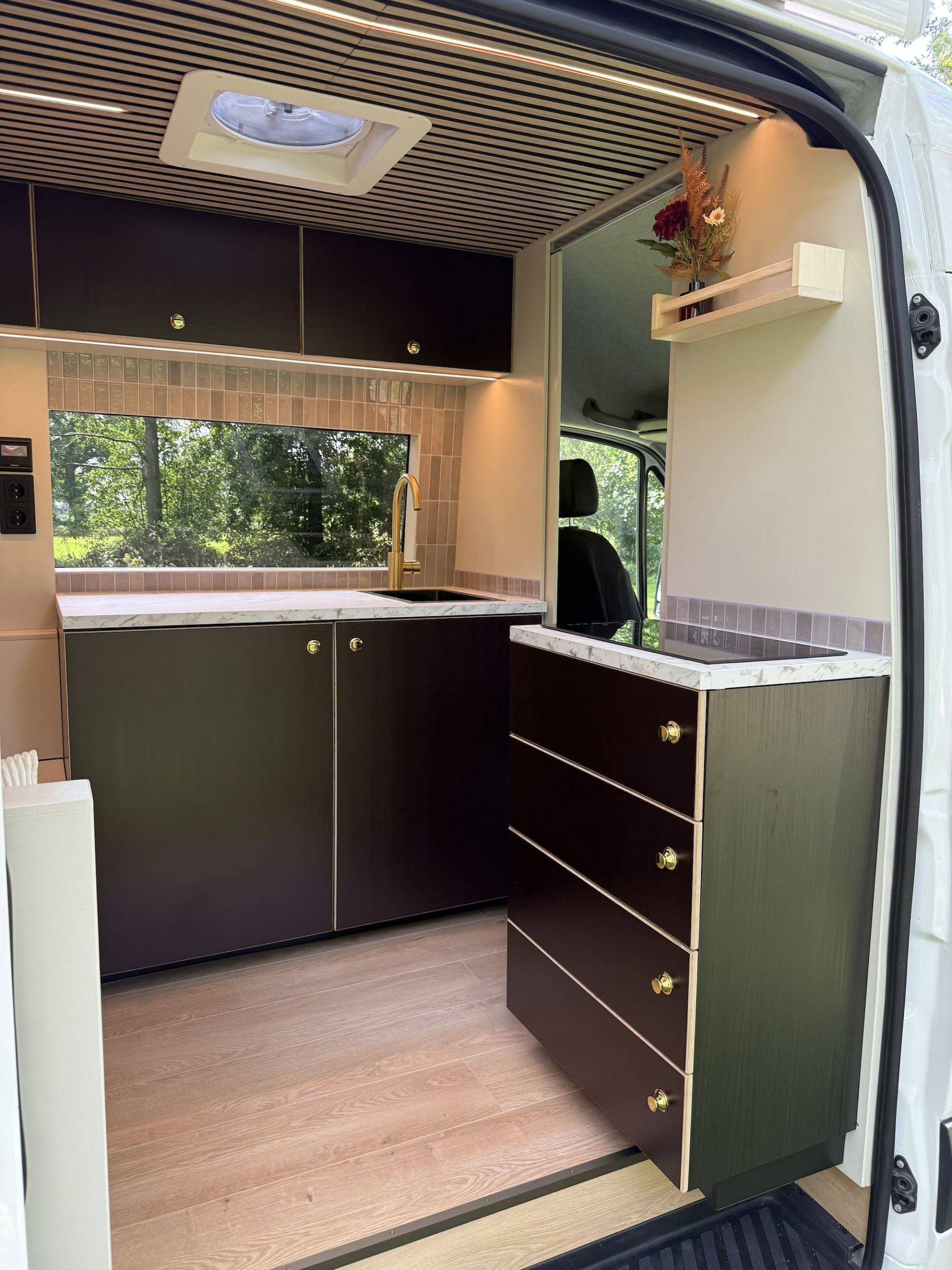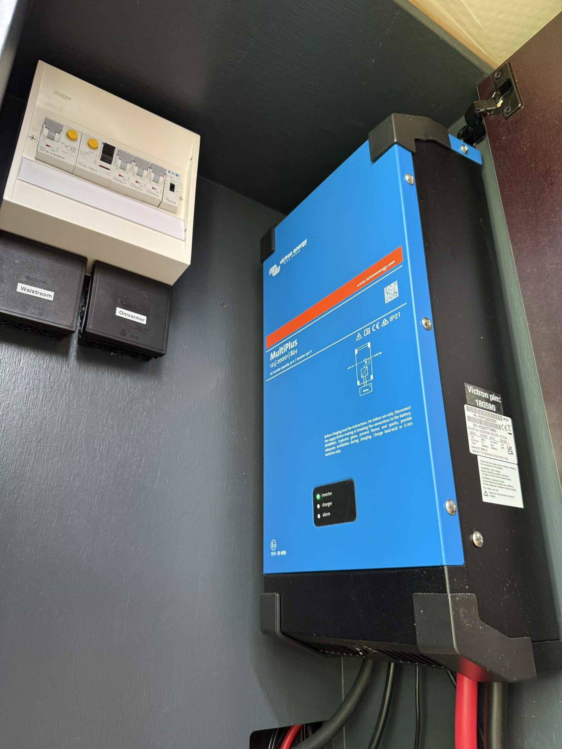 Deze camper is zelfvoorzienend te gebruiken dankzij zonnepanelen, laden via de dynamo en een krachtige lithiumaccu. Het elektrisch systeem is door ons op maat ontworpen en biedt alles wat je nodig hebt: koken op inductie, warm water via een elektrische boiler en verwarming of koeling met de dakairco.
