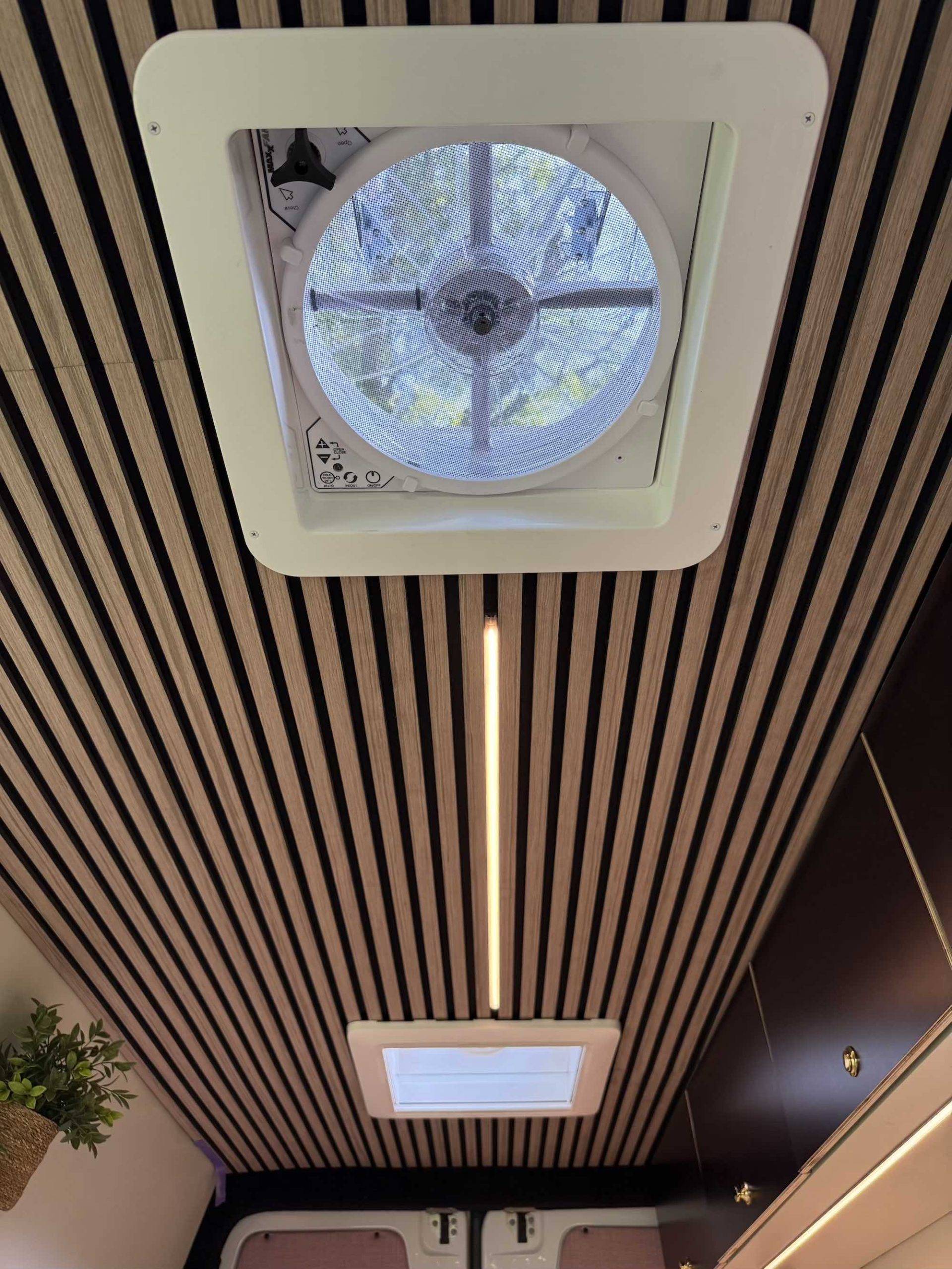Voor ventilatie zorgen de dakventilator en het dakraam. De draaibare voorstoelen creëren een gezellige eethoek voor vier personen. Het ruime watersysteem van 100 liter voorziet je meerdere dagen van water, ook bij gebruik van de buitendouche.
