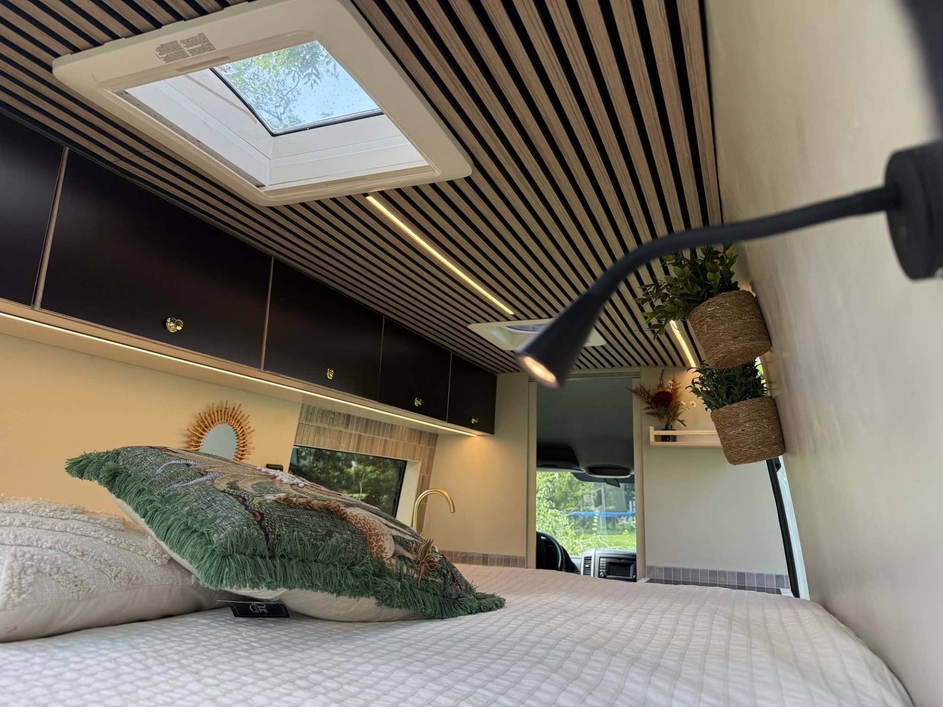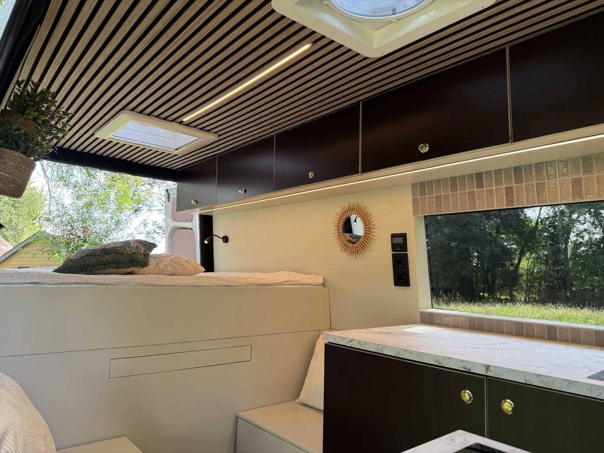 Tot slot maken speelse details zoals ronde raampjes, een sfeervolle inrichting en een grote luifel met verlichting deze camper helemaal af.
